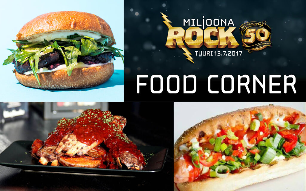 Miljoona Rock-alueella torstaina 13.7.2017 juhlijoita palvelee Miljoona Rock Food Corner, jossa on myynnissä ruokaa monenlaiseen