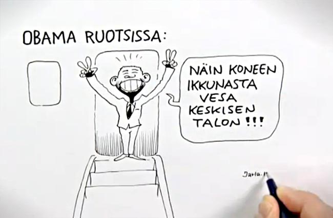 TV1:n A-studiossa klo 21.05 keskiviikkona 4.9.2013 viikon Jarla -pilapiirrososiossa Jarla (Fingerporin piirtäjä) piirsi pilakuvan, jonka otsikkona oli ”Obama Ruotsissa”.